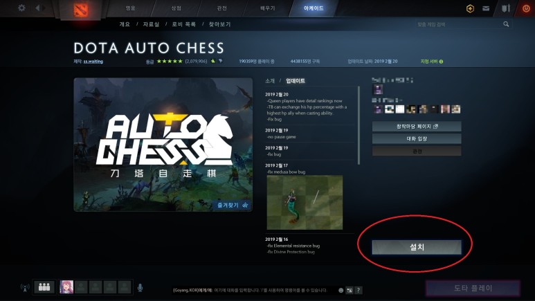 6. 처음이면 설치를 클릭합니다.현재 19년 2월 20일 오후 5시 기준 19만명 플레이 중입니다.대략 440만 명이 구독해서 플레이를 했어요.