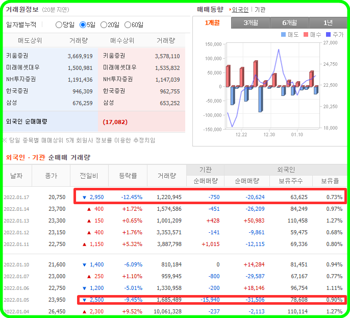 자동운전 관련주 인포뱅크의 최근 거래동향을 살펴보면 우선 외국인의 매수세와 매도가 번갈아가며 들어와 적절한 타이밍에 수익을 실현하고 있음을 알 수 있습니다.지난 4일 거래일 동안 꾸준히 사들이던 물량을 오늘 한꺼번에 털어내며 12% 이상 하락시킨 모습이 눈에 띄어 이 매매가 계속되고 있습니다.그 때문에 주가가 급락하는 현상이 나타나고 있는 것으로 해석됩니다.