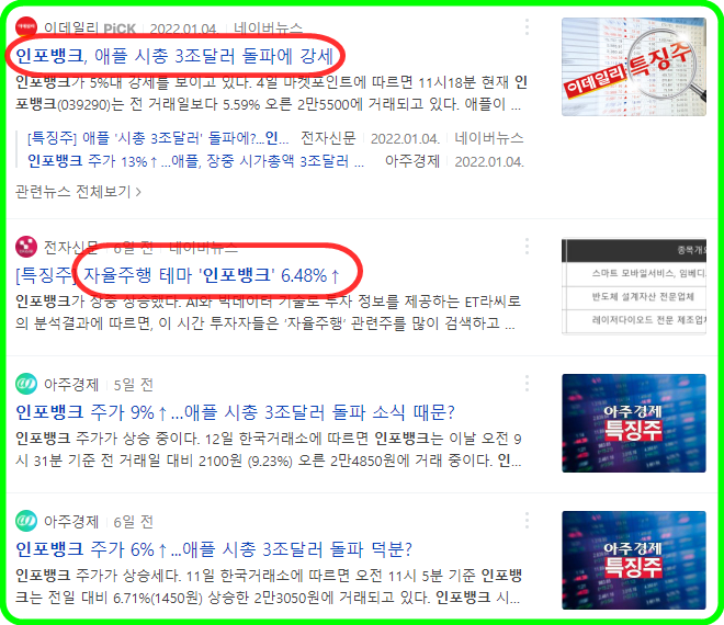 자율주 인포뱅크 뉴스를 보면 당연히 애플카와 관련된 종목인 만큼 애플 주가가 강세를 보여 수급이 집중되고 있는 뉴스를 볼 수 있습니다.애플이 사상 처음으로 시가총액 초과액을 돌파한 영향으로 애플 카 플레이 솔루션을 개발한 차량용 소프트웨어 제조회사로서 ‘인포뱅크’의 주가가 5% 이상 상승하고 있다는 소식이 있습니다.전체적으로 애플과의 협업 탓인지 관련주로 떠오르고 있으니 참고해 주시면 감사하겠습니다.