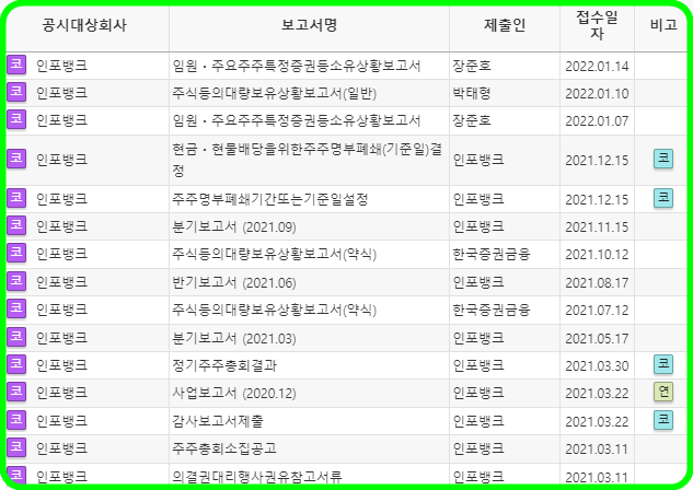 자율주행 관련주 인포뱅크 공시를 보면 특별한 내용 없이 일반적인 정기공시 등이 대부분입니다.넘어가도록 하겠습니다