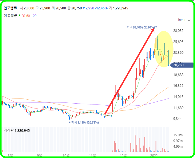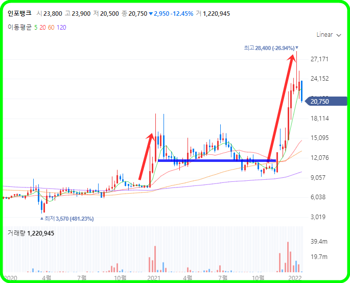 자동운전 관련주 인포뱅크 주가차트를 볼까요?흐름이 좋다고 할 수 있는 상황입니다.일단 주봉상 20년 3월 팬데믹 폭락 때 3,000으로 바닥을 치고 반등에 바로 성공해 좋은 흐름을 만들었고, 21년 1월을 전후해 강한 상승장을 만들었습니다.(애플카 자율주행으로 수급이 대단했습니다.) 그리고 다시 1년 가까이 밀려 보합세를 거듭하다 한 번 빠지는 모습을 보이다가 12월 들어서는 강하게 끌어올렸습니다.올해 1월 4일에는 최고점까지 행했던 주가가 현재는 상승되어 매도 중에서 일시적으로 오늘 거래를 끝냈습니다.제가 보기에는 ᅥᆫᅮ 전후로 제자리걸음이었지만 애플카 이슈와 함께 다시 한번 충분히 슛이 나오는 종목이라고 생각합니다.다만 밀리는 자리가 제자리걸음인 상태에서 작년처럼 길게 나올 가능성이 있기 때문에 적절한 타이밍이 중요하다고 생각하고, 충분히 상황을 보고 들어가도 늦지 않다고 생각합니다.참고로 블로그라 제한이 많은점 양해부탁드립니다.추가 정보나 필요한 내용이 있으시면 맨 위 오픈카톡으로 편하게 문의주세요.