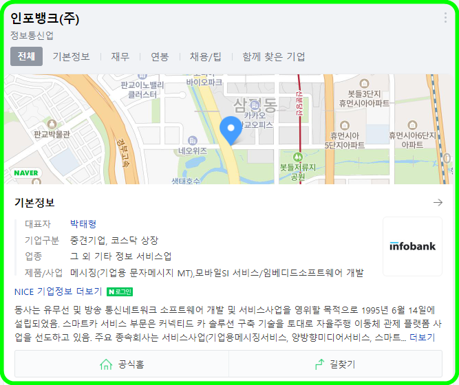 자율주행관련주 인포뱅크는 1995년 6월 14일 기타 정보서비스업을 목적으로 설립되어 2006년 7월 4일 코스닥에 상장된 대표적인 인공지능, 자율주행 관련 기업입니다.유무선 및 방송통신 네트워크 소프트웨어 개발 및 서비스 사업을 영위할 목적으로 설립되었으며, 현재는 스마트카 서비스 부문 커넥티드카 솔루션 구축 기술을 바탕으로 자율주행 이동체 관제 플랫폼 사업을 선도하고 있는 기업으로 널리 알려져 있습니다.주요 종속사들은 서비스 사업(기업 대상 메시징 서비스, 쌍방향 미디어 서비스, 스마트 카 서비스 등)과 기타 사업(소프트웨어 개발 및 솔루션 등)을 진행하고 있습니다.전년도의 매출액은 前 前 대 시가총액 前 コス コス, 코스닥 568위입니다.