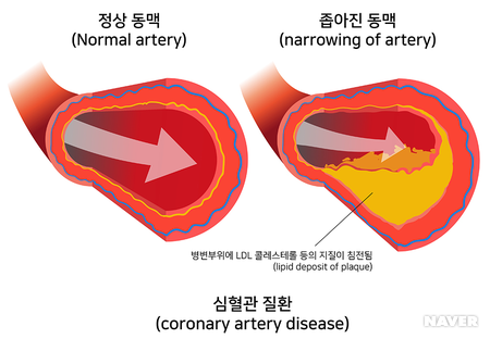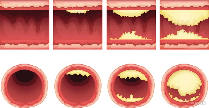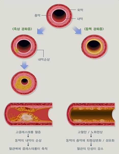 또 손상된 내막에 콜레스테롤이 쌓이면 죽종이 형성돼 혈관 지름이 50% 이상 협착돼 탄력을 잃는 것을 죽상경화증이라고 한다.