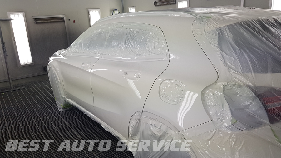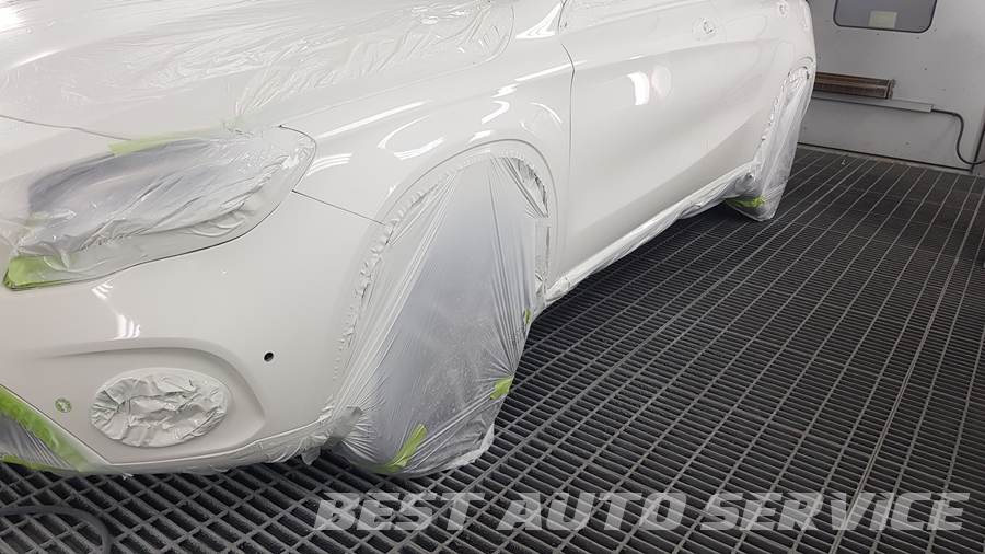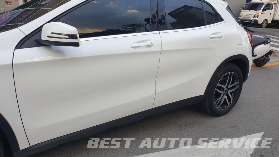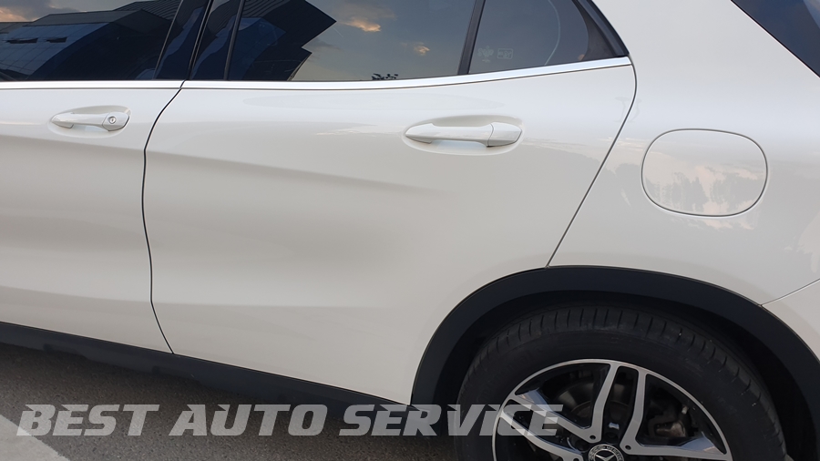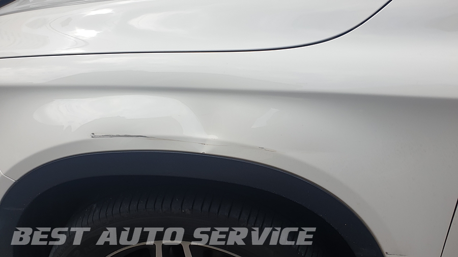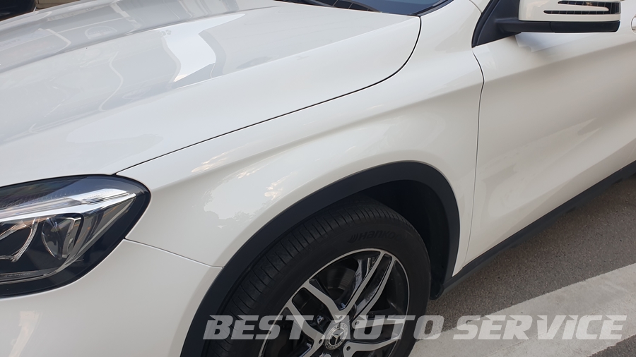 벤츠 GLA 좌측 프론트팬더입니다. 중앙 부근에 안쪽으로 들어가는 왜곡이 눈에 띄어, 근처에도 손상이 발생하고 있습니다. 판금도색으로 복원할 예정입니다.