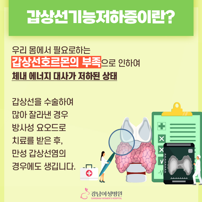 갑상선 기능 저하증이란 우리 몸에는 목 앞부분에 나비 모양의 내분비 기관인 갑상선이 존재합니다. 갑상선에서 생성되는 갑상선 호르몬은 우리 몸의 에너지 대사를 조절하는 역할을 하게 되며 호르몬 농도가 낮아져 체내 에너지 대사가 낮은 상태를 갑상선 기능 저하증이라고 합니다.