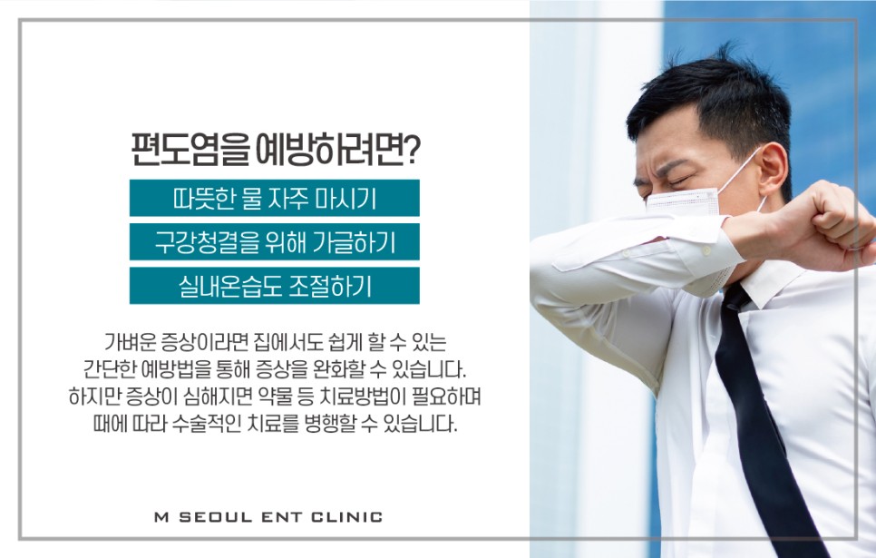 편도염 초기에는 항생제, 소염제 등의 약물치료로 증상이 빨리 호전될 수 있으므로 빠른 시일 내에 이비인후과를 방문하여 정확한 검진을 받는 것이 좋습니다.