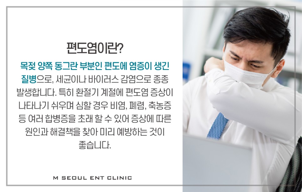 ‘감기일까?’라는 가벼운 걱정으로 치료시기를 놓치는 경우가 많지만 편도염이 장기화되어 만성적으로 악화될 수 있기 때문에 바로 이비인후과를 찾는 것이 좋습니다.