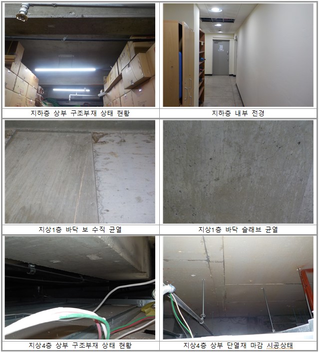 ▷지하층에서 보나 슬래브 부재로부터 다수의 균열(0.1㎜ 이내)이 조사됐다.▷ 내부 벽체에서 발생한 균열은 보수하여 보수완료 상태이다.▶ 지하층에서 조사된 구조체의 균열은 폭 0.1㎜ 이내의 미세균열로 구조물의 안전성에 영향을 미치지 않을 것으로 보이며, 비구조체인 조적벽체에서 발생한 기존 결함은 보수를 통해 사용성 및 미관성이 확보된 상태다.