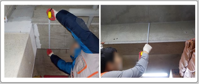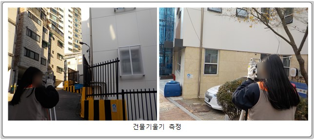 ▷ 본 진단 대상 건축물의 외벽 기울기 측정 결과 다수의 측정 부위에서 양호한 상태로 측정되었으나 한 곳에서 1/327의 변위비를 나타내고 있다. 이는 외부 벽체의 마무리에 따른 변위비로 판단되며 건축물의 기울기는 양호한 것으로 판단된다.