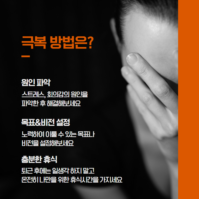 극복할 수 있는 방법은?극복할 수 있는 가장 기본적인 방법은 원인을 파악하는 것입니다.내가 무엇 때문에 이렇게 스트레스를 받고, 회의감을 느끼는지 원인을 확인해 보십시오.그리고 단기간에 달성할 수 있는 목표나 비전을 정하는 것도 좋다고 생각합니다.제가 열심히 노력함으로써 이룰 수 있는 것, 보람 있는 것 등을 계획하고 실천한다면 지금 하고 있는 일에도 집중할 수 있고 무기력증을 탈피할 수 있습니다.