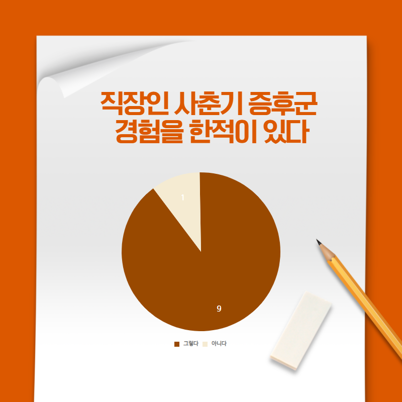 10명 중에 9명이 겪는다고? 실제로 한 국내 구직 포털사이트에서 직장인 사춘기 증후군을 겪었느냐는 질문에 직춘기, 즉 직장인 사춘기 증후군은 10명 중 9명 정도가 경험한 것으로 나타났다.