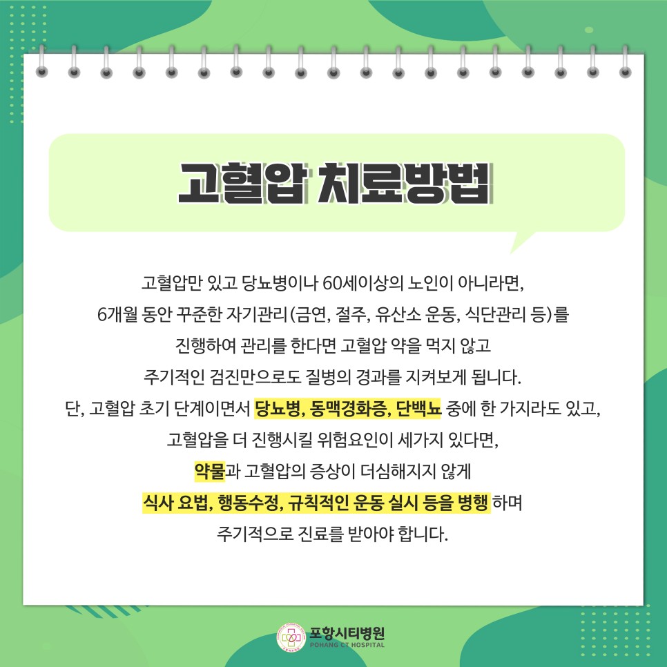 치료방법 고혈압만으로 당뇨병이나 60세 이상 노인이 아닌 경우에는 6개월간 자가관리(금연, 절주, 유산소운동, 식단관리 등)를 하여 관리하는 경우 고혈압약을 복용하지 말고 주기적인 검진만으로 질병의 경과를 지켜봅니다.단 고혈압의 초기단계이면서도 당뇨병, 동맥경화증, 단백뇨 중 하나이며 고혈압을 더욱 진행시키는 위험요인이 3가지 있는 경우 약물과 고혈압의 증상이 더 심해지지 않도록 식이요법, 행동수정, 규칙적인 운동실시 등을 병행하여 주기적으로 진료를 받아야 합니다.