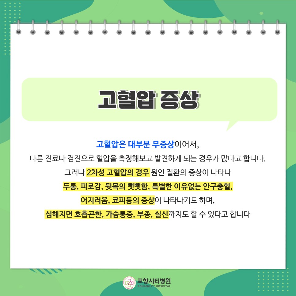 고혈압 합병증과 혈압 상승의 원인 및 증상 / 포항시티병원 안녕하세요.포항시티병원입니다.오늘은 고혈압의 원인과 증상과 진단 기준, 치료 방법 등에 대해 알려 드리겠습니다.