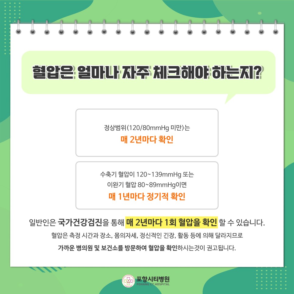 정상범위(120/80mmHg 미만)는 2년마다 확인수축기혈압이 120~139mmHg 또는 이완기혈압 80~89mmHg이면 1년마다 정기적으로 확인, 일반인은 국가건강검진을 통해 2년마다 1회 혈압을 확인할 수 있습니다.혈압은 측정시간과 장소, 몸의 자세, 정신적 긴장, 활동 등에 따라 달라지므로 가까운 병원이나 보건소에서 혈압을 확인하세요.고혈압 증상
