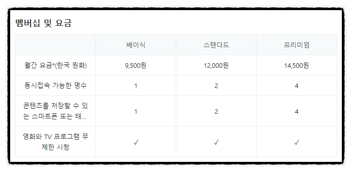 출처 : 네이버의 차이점은 영상 / 화질 / 동시 접속 가능한 인원 / 컨텐츠 저장 기기 개수에 대해서입니다.