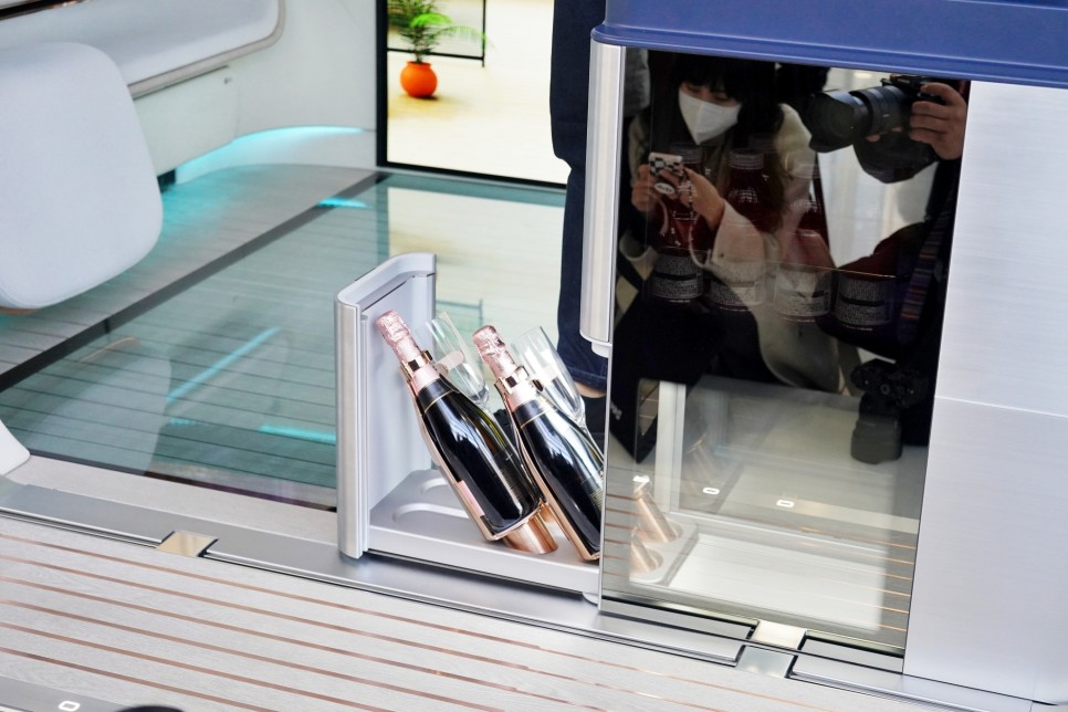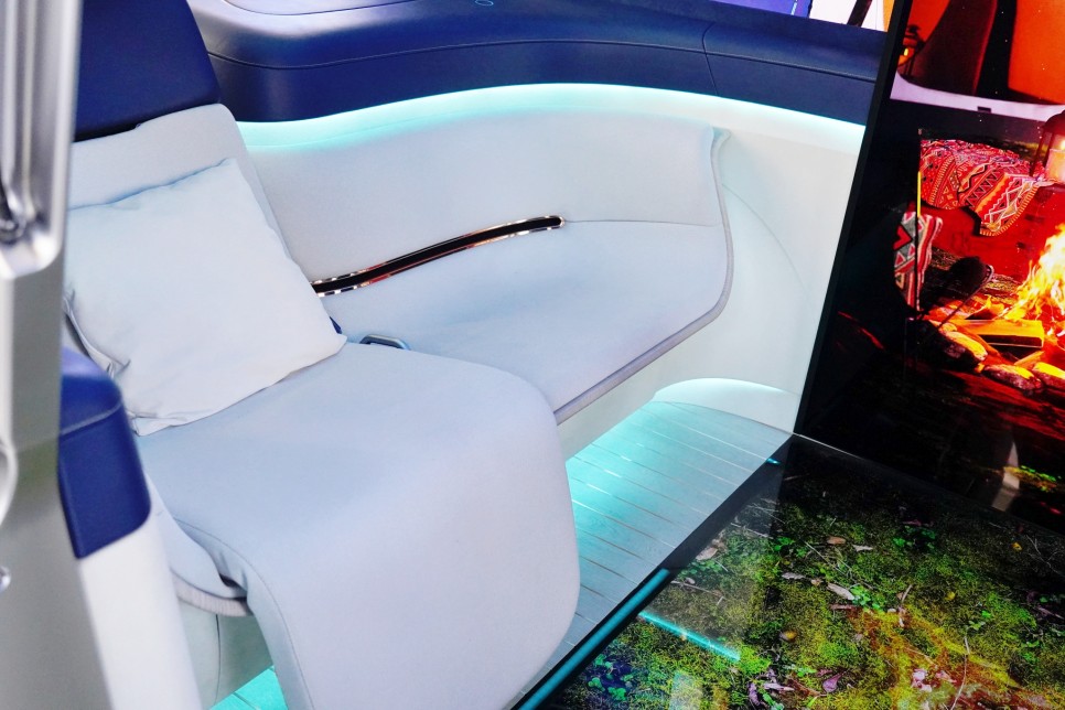 사람이 탑승하자 가상 휴먼 레어가 안에서 반겨줬어요 레어 가이드에 따라 차량의 제품과 서비스를 제어하고 공간을 활용할 수 있다고 해요. 가전 제품인 LG답게 미래의 집처럼 차량 내부를 잘 구성하고 있었습니다.