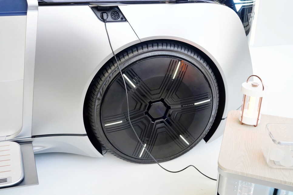 전기자동차로 바퀴도 남다릅니다. 물론 220V 단자가 있기 때문에 캠핑용품을 이용할 수도 있는 것입니다. 미래에는 LG 옴니팟 자율주행차로 루프도 있겠지.전국을 일주하며 캠프를 떠나고 싶은 욕구가 뿜뿜.