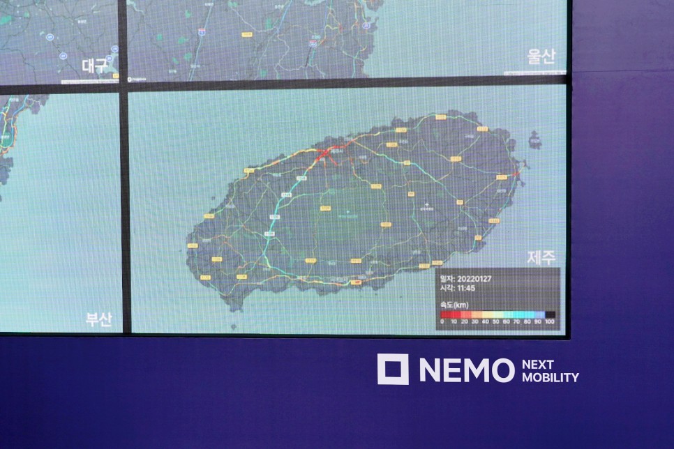 위에는 제주도인데 리얼타임으로 어디가 막히는지 한눈에 알아볼 수 있어요 어느 도로가 없어지고 새로 추가되는지 반영이 된대요. 이제 카카오 T와 카카오 맵 서비스를 통해 최적의 이동 경로를 분석할 수 있지요?
