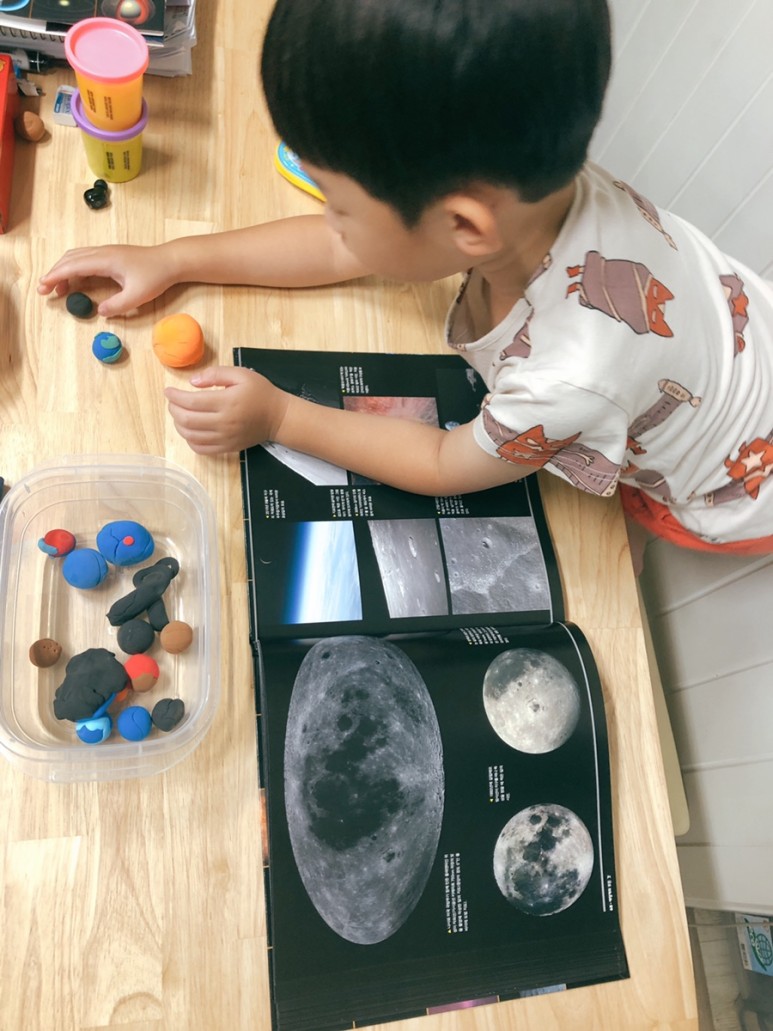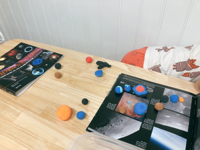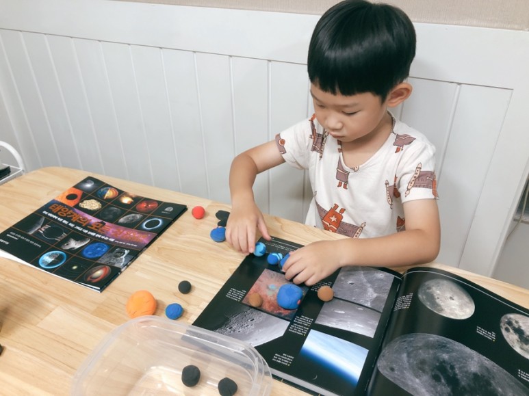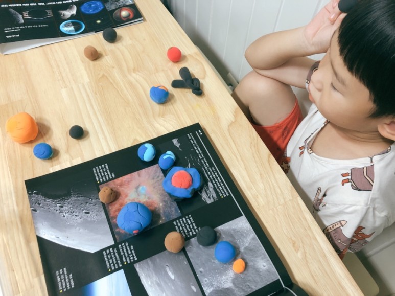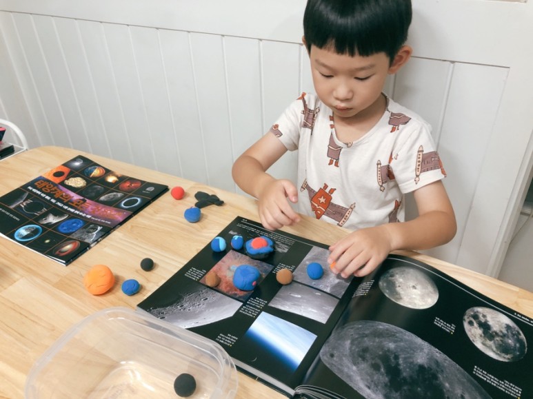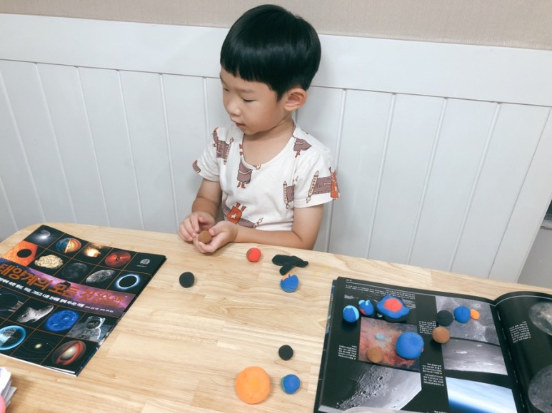 아직 전문지식까지 배우기는 어렵기 때문에 사진으로 조금씩 배우면서 컬러점토로 특징을 살려 나만의 태양계 행성 순으로 만들어보고 영어로 노래도 불러봅니다.