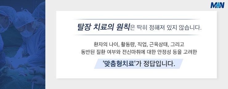 이때 복벽을 강화하기 위해 주변 조직을 이용하여 당겨 꿰매는 방법이 있고 인체에 무해한 인공적인 소재를 이용하여 보강하는 방법이 있습니다. 성인 탈장의 경우 재발률을 줄이기 위해 인공적인 소재를 이용한 수술 방법을 주로 시행하고 있습니다. 메쉬라고 불리는 인공적인 소재는 인체에 무해한 성분으로 제작되어 큰 합병증 없이 회복되기 때문에 전 세계적으로 널리 이용되고 있습니다.수술 방법은 환자의 나이와 상태에 따라 선택하게 되는데 복강경 수술법의 경우 통증이 적고 회복이 빠르다는 장점이 있습니다.