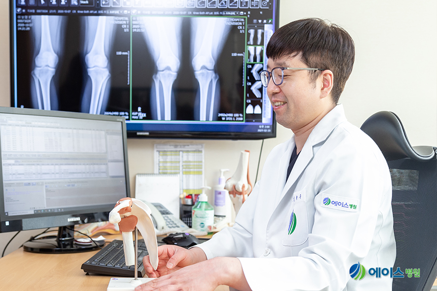 어깨통증으로 내원한 환자의 상태를 청취하고 있는 안산에이스병원 관절센터 김학수 원장