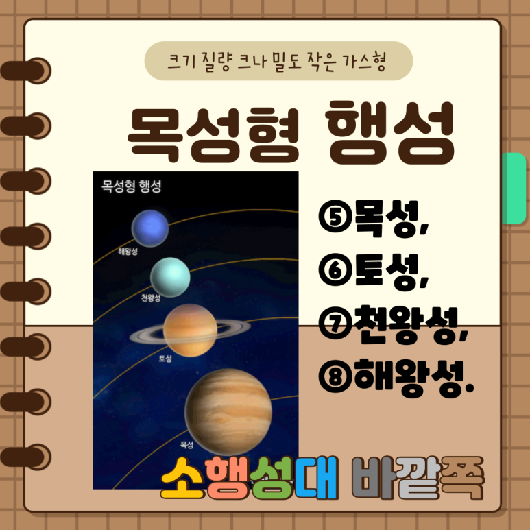 행성에는 소행성대보다 안쪽의 수성·금성·지구·화성으로부터 바깥쪽의 목성·토성·천왕성·해왕성이 있습니다. 이들은 각각 지구형 행성(terrestrial planet)과 목성형 행성(jovian planet)이라고 부릅니다. 지구형 행성은 암석으로 되어 있어 위성이 없거나 수가 적습니다. 목성형 행성은 거대 기체 행성(giant gaseous planet)으로 불리며, 4개의 목성형 행성은 태양을 제외한 태양계 질량의 99%를 차지하고 있습니다. 기체 행성이기 때문에 밀도는 비교적 낮은 반면 많은 위성을 따릅니다. 또한 목성형 행성은 모두 고리를 두르고 있습니다.
