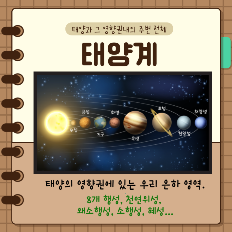 저희 은하 태양계는 태양과 태양의 영향권 내에 있는 천체들로 이루어진 계입니다 항성의 태양, 태양을 공전하는 행성, 그 행성을 공전하는 위성, 그리고 왜소행성(dwarfplanet)과 소행성, 혜성, 카이퍼대(Kuiper belt) 천체를 비롯한 태양계의 소천체(small Solar System body, SSB), 행성간의 먼지(interplanetary)로 구성되어 있습니다.