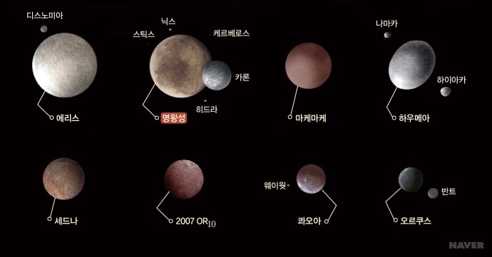 그러나 카이퍼벨트로 명왕성보다 더 큰 천체 2003UB313(미국에서는 제나로 명명)이 발견되면서 명왕성의 지위는 흔들렸습니다. 명왕성을 계속 행성이라고 부른다면 저처럼 명왕성보다 큰 천체도 행성이라고 해야 하니까요. 그래서 많은 천문학자들은 명왕성을 왜소행성으로 분류하기로 결정하고 행성의 정의를 명확히 했습니다.