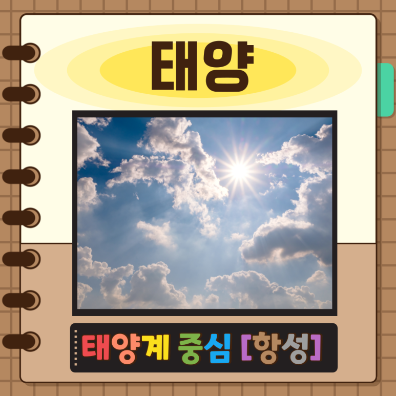 태양계의 중심인 태양계의 중심에 위치한 G2형 별로 항성의 종족 I에 속합니다. 약 46억년 전에 탄생하였으며, 향후 약 50억년을 주계열성 단계에 머물 것으로 예상됩니다. 표면 온도는 약 5,860K, 절대 등급은 +4.83이라고 합니다. 지름은 약 139만 2천km로 지구보다 109배 크며, 질량은 2×kg입니다. 태양은 태양계 전체 질량의 99.86%를 차지하지만 각운동량으로 계산하면 태양계 전체의 2%에 불과합니다. 지구에서 평균 1억4960만 km(1AU) 떨어져 있지만 지구는 태양을 타원궤도를 따라 공전하기 때문에 1월 근일점에 있을 때가 가장 가깝고 7월 원일점에 있을 때가 가장 멉니다.