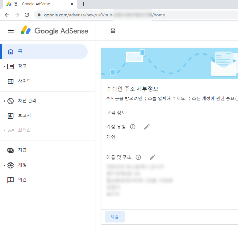 구글 애드센스 화면에 진입하여 구글 애드센스 계정이 생성되었습니다. 어드센스에서 아래와 같이 상세정보 입력을 요청합니다. 우편번호를 포함한 주소정보를 틀림없이 잘 등록해 주세요. 아파트의 경우 동호수도 정확해야 합니다.