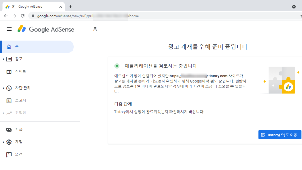 애드센스 가입 신청 단계의 최종 완료가 티스토리에 애드센스 광고 탑재를 위한 가입 신청을 위한 모든 절차가 완료되었습니다.