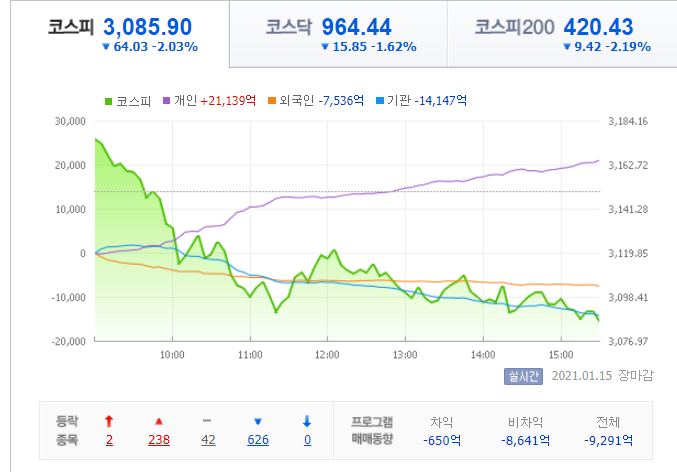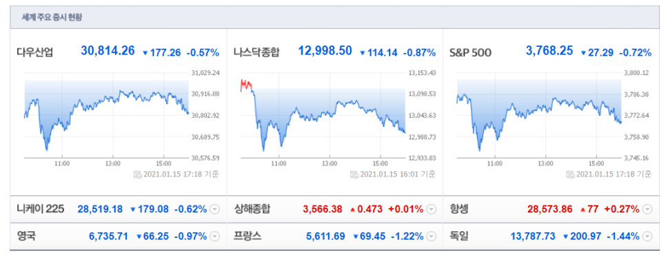 1월 둘째 주 증시는 미국 유럽 한국 할 것 없이 모두 큰 폭으로 하락했습니다. 목요일에 바이든 정부가 발표한 경기부양책에도 불구하고 주가가 떨어진 것에 대한 부양책에 대한 기대감이 이미 주가에 반영되어 전문가들은 “소문에 사고 뉴스에 파는” 매매법을 쓰고 있다고 말했습니다.