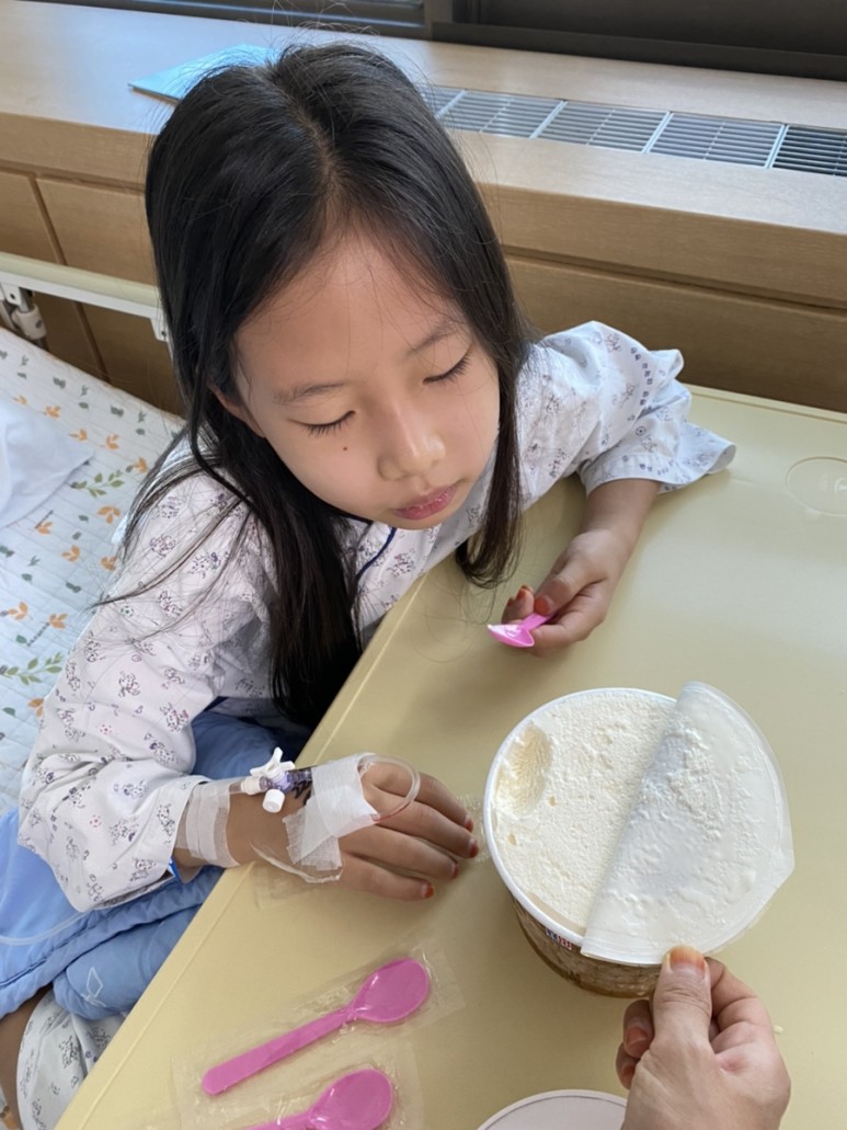 수술 후 저녁까지 단식하다 보니 먹을 수 있는 것은 아이스크림을 가장 기대하던 딸이지만 목이 아파 제대로 먹을 수가 없었다.그래도 좋아하는 아이스크림이라 먹을 수 있을 만큼 먹고 넣어놨어