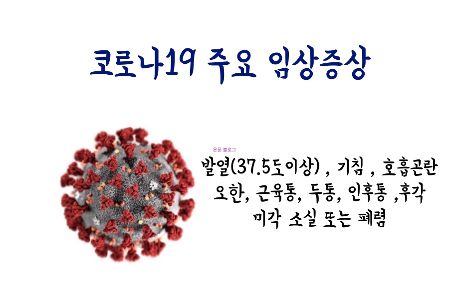 코로나19의 주요 임상 증상으로 발열(37.5도 이상)과 기침, 호흡곤란, 오한, 근육통, 두통, 인후통(편도염), 후각, 미각소실, 폐렴 증상이 대표적입니다.노란색을 칠한 부분은 제가 코로나19 확진 당시 나타났던 임상 증상입니다.
