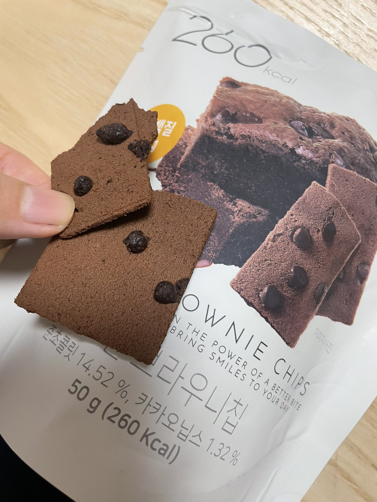 제품명 : 프로틴 브라우니 칩 구입처 : 올리브영 가격 : 2800칼로리 : 260Kcal 용량 : 50g 단백질 : 9g 준초콜릿 : 14.52% 카카오닙스 : 1.32%