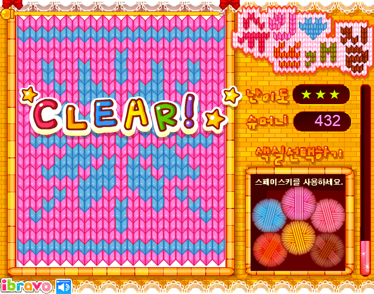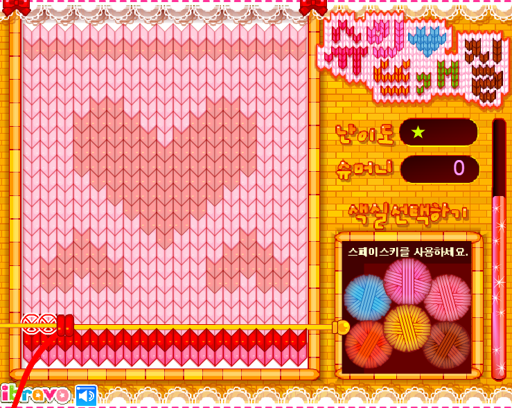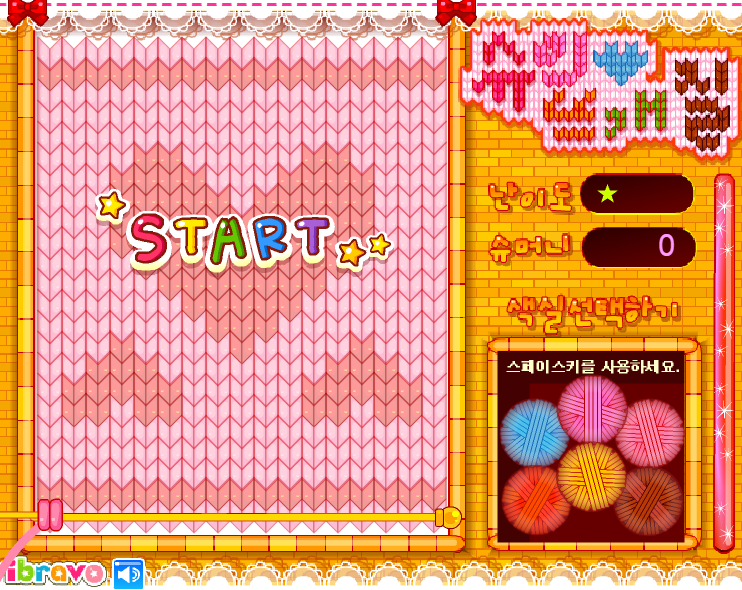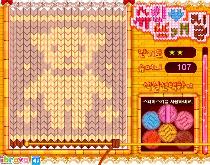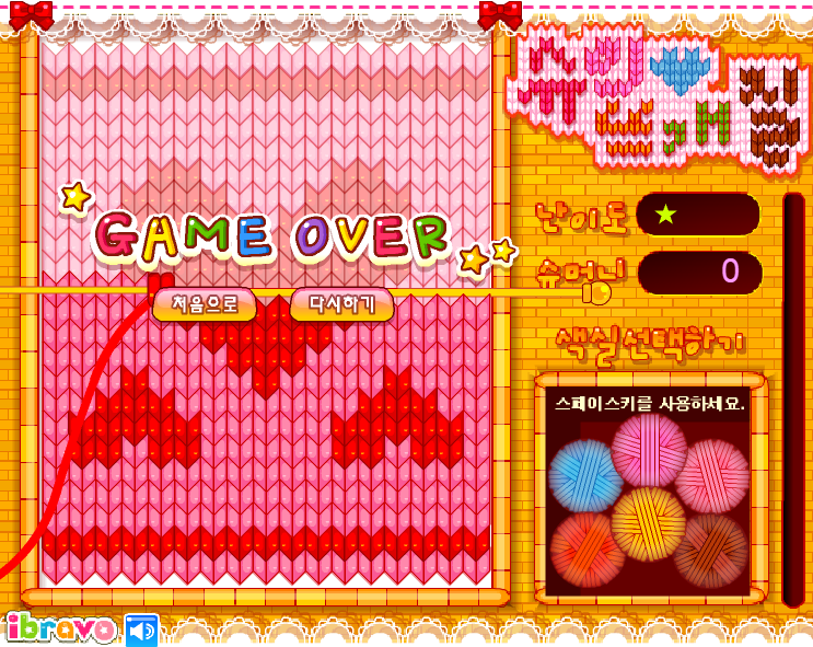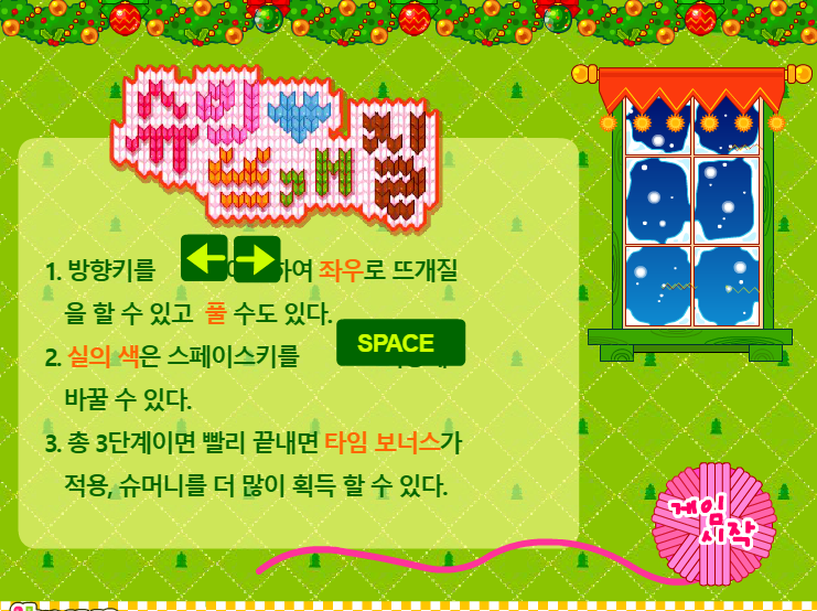 학습하세요.조작법이 상당히 간단해서 어린 친구들도 즐겁게 할 수 있을 것 같습니다. 방향키와 스페이스키 2개만으로 플레이가 가능하지만 좌우로 짤 때는 좌우키로 이동하고 실의 색깔을 바꿀 때는 space를 누르면 된다고 합니다. 총 3단계까지 있으며 빠르게 클리어할수록 점수는 높아집니다.