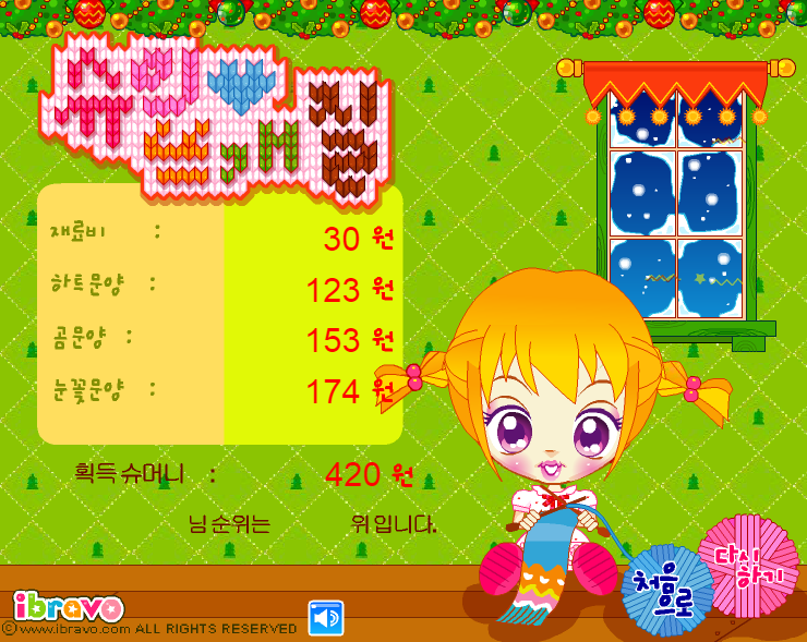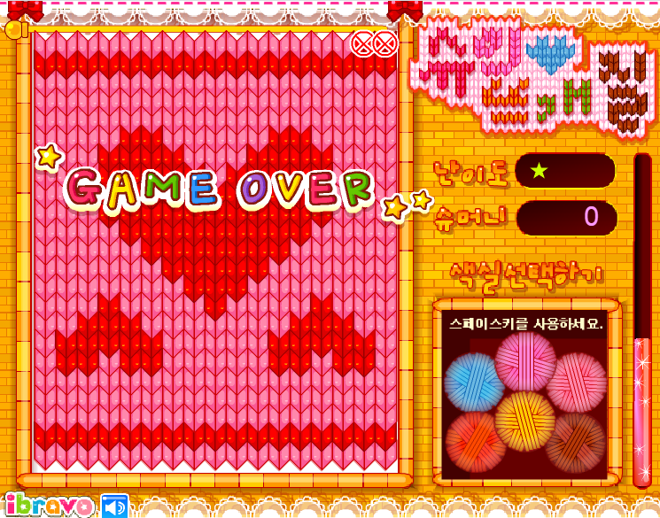 아 아쉽다ㅠ_ㅠ 마지막단계에서는 고작 3줄을 남기고 다 채우지 못해서 실패했네요. 끝까지 다 클리어하는 게 아니라면 지금까지 얻은 점수는 아무 의미가 없습니다. 3단계는 어렵지 않지만 시간이 빨리 지나가기 때문에 잦은 실수를 가급적 하지 말고 뜨개질을 하는 것이 중요합니다.