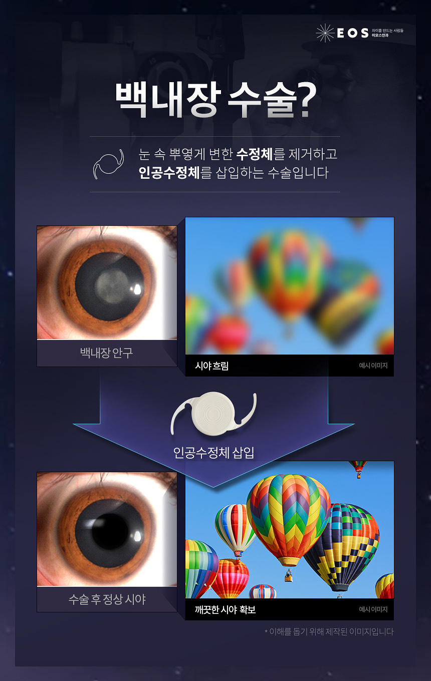 만약 백내장 렌즈 삽입을 진행하면서 시력 개선까지 기대하고 싶으신 분이라면 1:1 맞춤형 피팅 시스템으로 다양한 후유증과 불편함을 줄이고 있는 EOS에서 필요한 검사와 진단을 받아보시기 바랍니다.