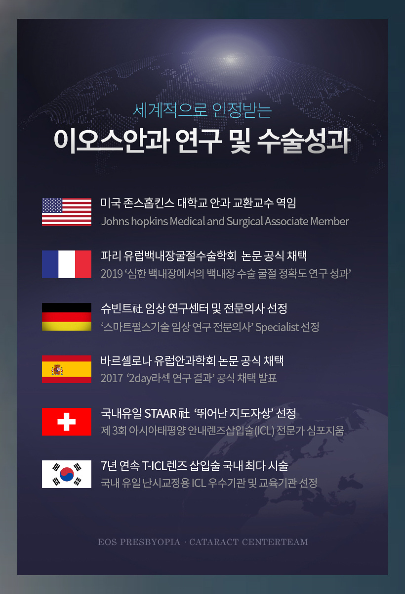 백내장 렌즈 삽입을 진행하는 EOS 의료진은 모두 대학병원 출신 안과 전문의로 미국 존스홉킨스 안과 교환교수 역임 및 백내장 교과서 제작에도 참여한 바 있습니다.