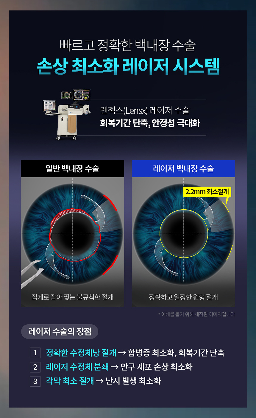 아무리 좋은 렌즈를 선택해도 백내장 렌즈 삽입이 정확하게 이뤄져야 빛 번짐이나 난시 등의 증상을 비롯해 다시 수술을 해야 할 가능성도 낮춰주기 때문에 의료진의 숙련도와 노하우를 반드시 확인해야 합니다.