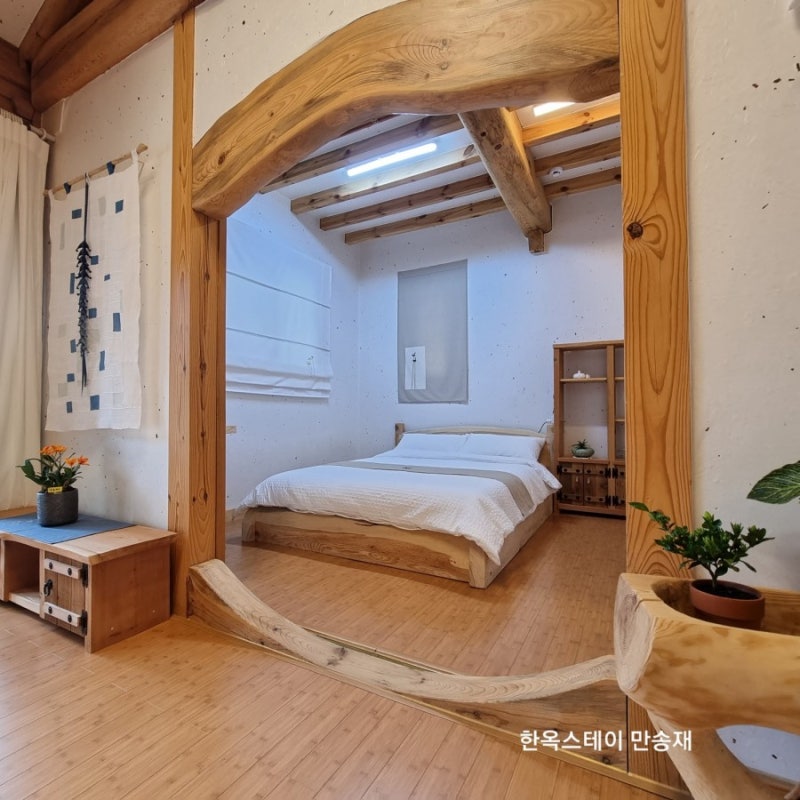 고즈넉한 한옥 만선재.전통 한옥숙소 만선재는 소나무 중 가장 단단하고 품질이 우수한 황장목(=금강송)으로만 지어져 실내로 들어서는 순간 은은한 소나무향기를 느낄 수 있습니다.주인인 한옥목수가 직접 지은 한옥만선재. 남의 집만 짓던 한옥목수가 정성스럽게 지은 우리 집 만선재입니다.한옥과 배롱나무의 조화가 아주 좋습니다.