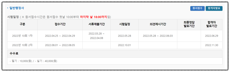 2022년의 경우 1차는 5월 28일, 2차는 10월 1일에 시행했습니다. 2차 시험 결과는 11월 30일에 나와서 아직도 기다리는 분들이 많아요.