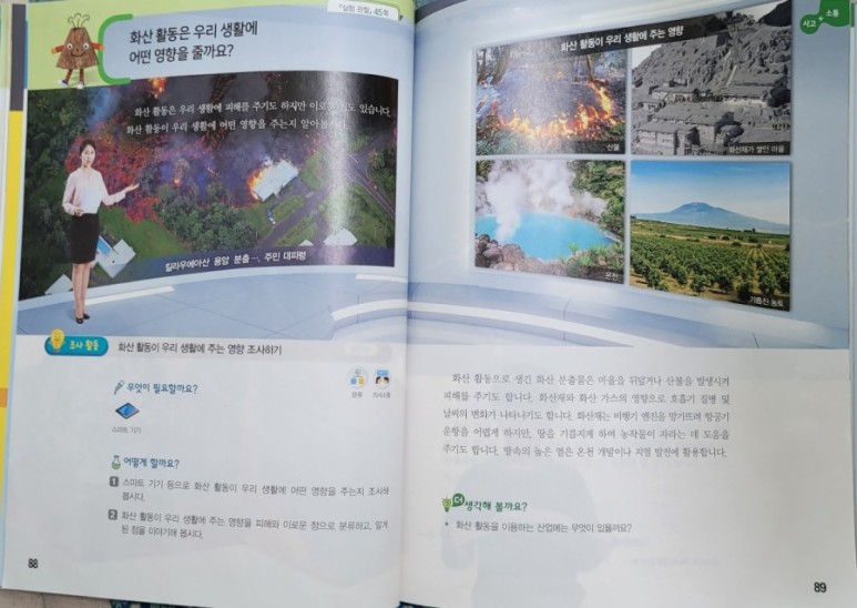 교과서 사진 수업 보기, 화산 활동이 우리 생활에 미치는 영향을 조사하는 것, 조사 주제를 화산 활동이 우리 생활에 미치는 영향을 조사하는 것으로 제시하고 피해와 유리한 점을 가리지 않고 다양하게 조사하기로 했습니다.다음 활동으로 피해와 이점을 구분하는 활동을 합니다.