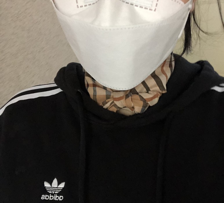 피부색 밴드를 띤 모습이다!테리가 붙어 있어서 상처가 제대로 보이지 않는다.