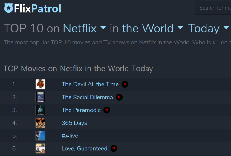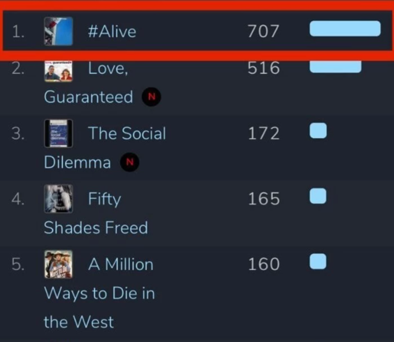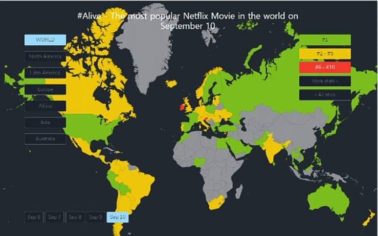영상콘텐츠 순위 차트를 제공하는 넷플릭스 Flix Patrol에 따르면 10일 살아있는(Alive)은 세계 35개국 무비차트에서 1위에 올랐다.