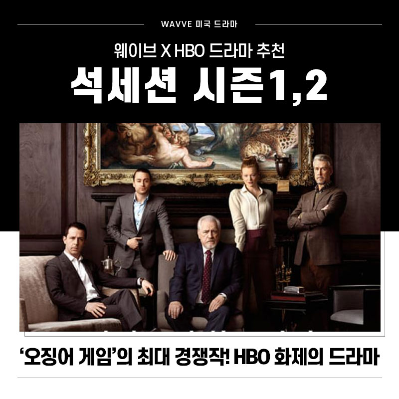 ◆ 제러미 스트롱, 브라이언 콕스, 키에란 칼킨, 사라 스누크, 앨런 러그, 매튜 맥페이든 외 ◆ 미국 ◆ HBO ◆ 드라마 ◆ 청소년 관람불가 제작 : 제시 암스트롱 시즌1-10부작, 시즌2-10부작 스트리밍 : 웨이브(wavve) 독점