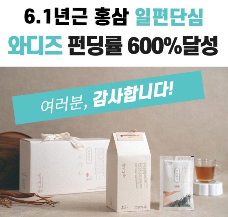 Wadiz 펀딩으로 펀딩률 600% 달성에 성공하였습니다. 와디즈에서 성별, 연령대 비율 40~50대 중년 남성분들이 풍기애삼의 한결같은 6년근 홍삼 100%를 중년 남성 건강식품으로 가장 많이 선택해 주셨습니다.