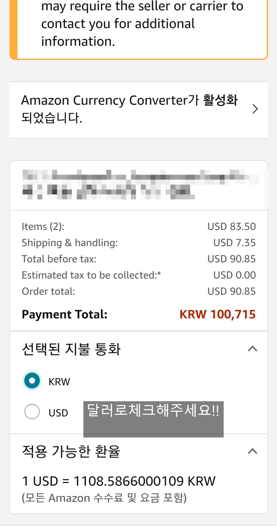 쇼핑 바구니를 선 그리고, 이렇게 두가지 다 보고 다른 것으로 보고 결제하세요.꼭 주소 우편 번호, 전화 번호를 다시 한번 잘 보고 결제를 누르면 이렇게 그날의 환율과 배송비, 제품 가격, 총 결제 금액이 표시됩니다.