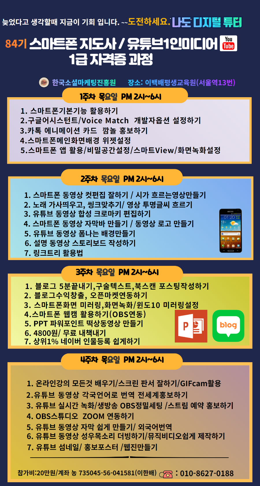 그러기 위해서는 일차적으로 스마트폰을 잘 활용할 수 있는 능력이 필요합니다.본 교육원에서는 스마트폰과 유튜브로 수익을 창출할 수 있는 4주 과정을 아래와 같이 진행합니다.일정정보기일 : 3월부터 매주 목요일 4주 장소 : 한국소셜마케팅진흥원(서울역 13번) 참가비 : 20만원(자격별) 계좌 : 농협 735045-56-041581 이한배 문의 : 01086270188 커리큘럼 표시