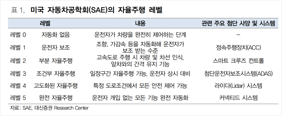 자율주행 단계(출전: 대신증권) 자율주행은 크게 5단계로 구분되는데, 현재 상용화된 단계는 레벨 1[정속운전(ACC)], 레벨 2[스마트 크루즈 컨트롤], 레벨 3[ADAS]입니다.